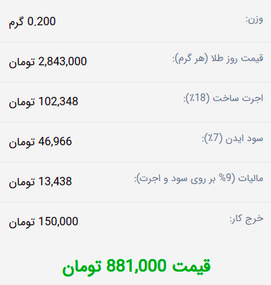 همانطور که در مثال مشاهده می فرمایید. وزن طلا در قیمت روز ضرب شده که در مثال بالا 0.200 * 2843000 = 568000 تومان می شود.